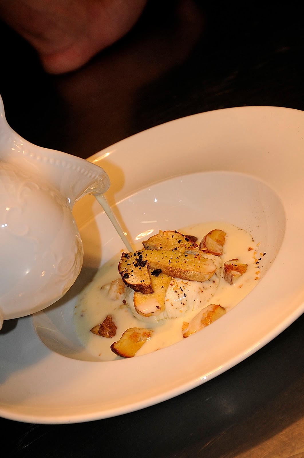 Eccolo, l'uovo poché con porcini cotti e crudi con "fonduta" di cipolla